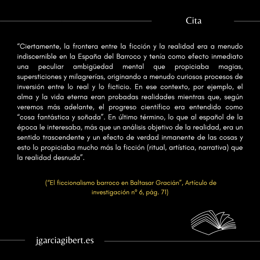 “(…) en El Criticón se teatraliza la más colosal representación del desengaño barroco, como lo hicieron, de una u otra forma, las obras cumbre que le precedieron en la literatura española del XVII: el Quijote, el Guzmán de Alfarache, La vida es sueño, La Dorotea, e incluso las esteticistas Soledades de Góngora”.